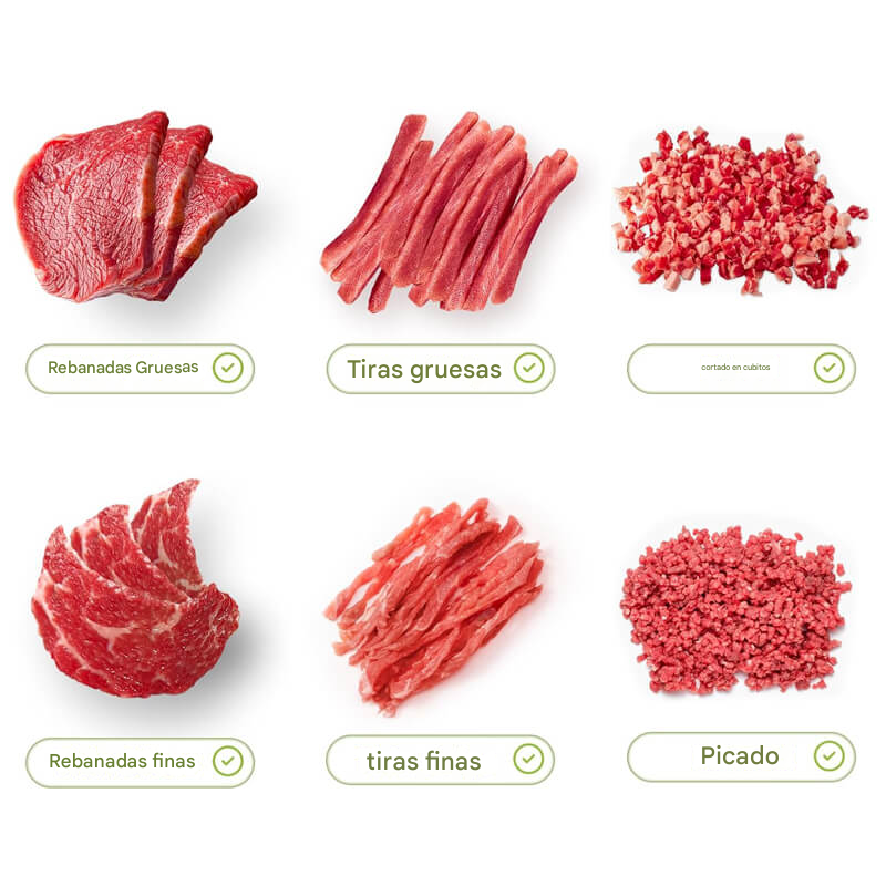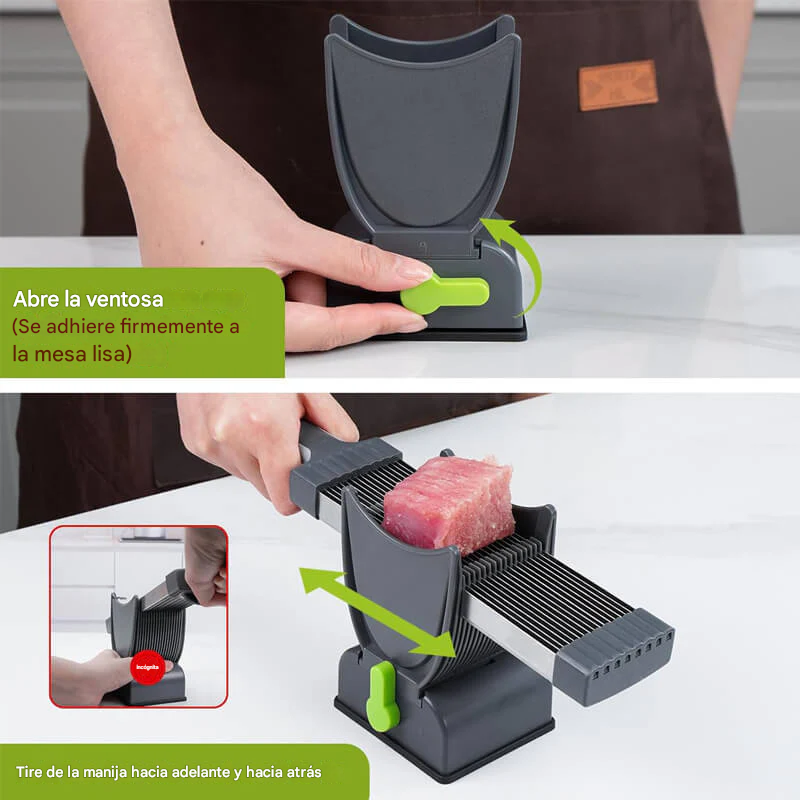 El corte se realiza en solo 4 pasos: levanta la palanca lateral, coloca la carne sobre ella, desliza la cuchilla hacia adelante y hacia atrás para cortar, levántala y listo, súper fácil de usar