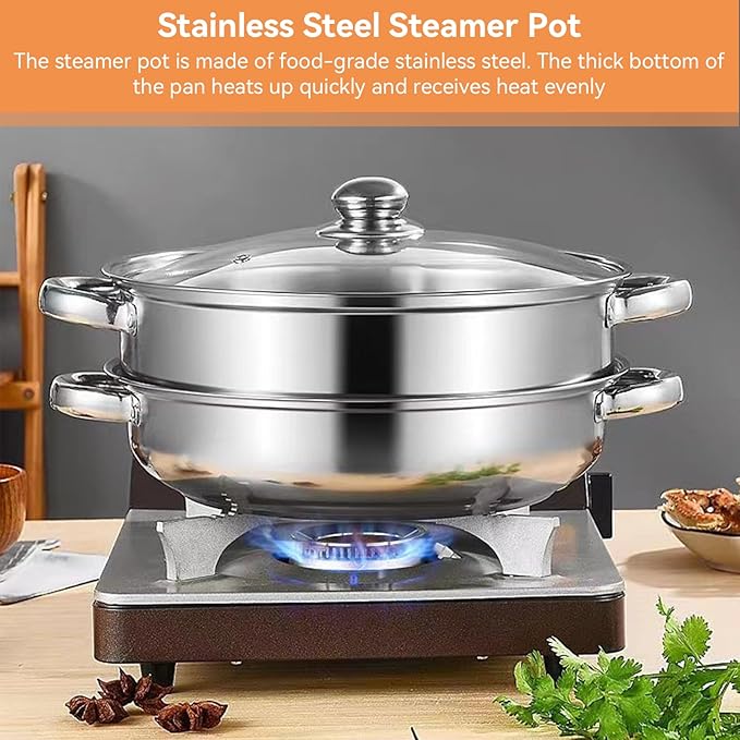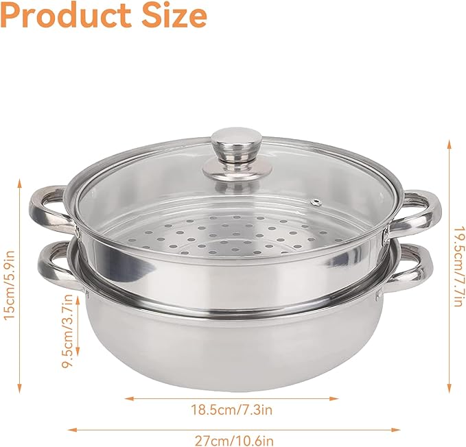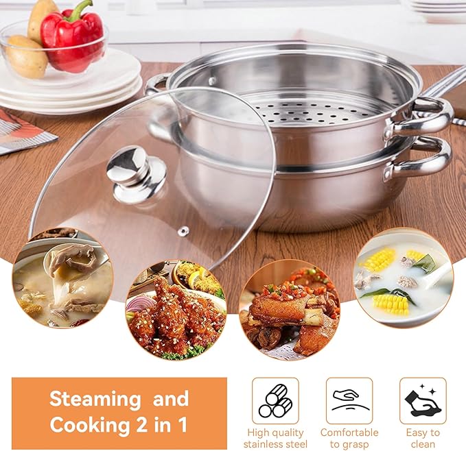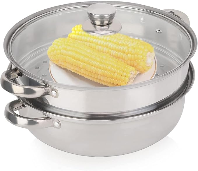 OLLA Y VAPORERA DE ALIMENTOS EN ACERO INOXIDABLE CON TAPA DE VIDRIO