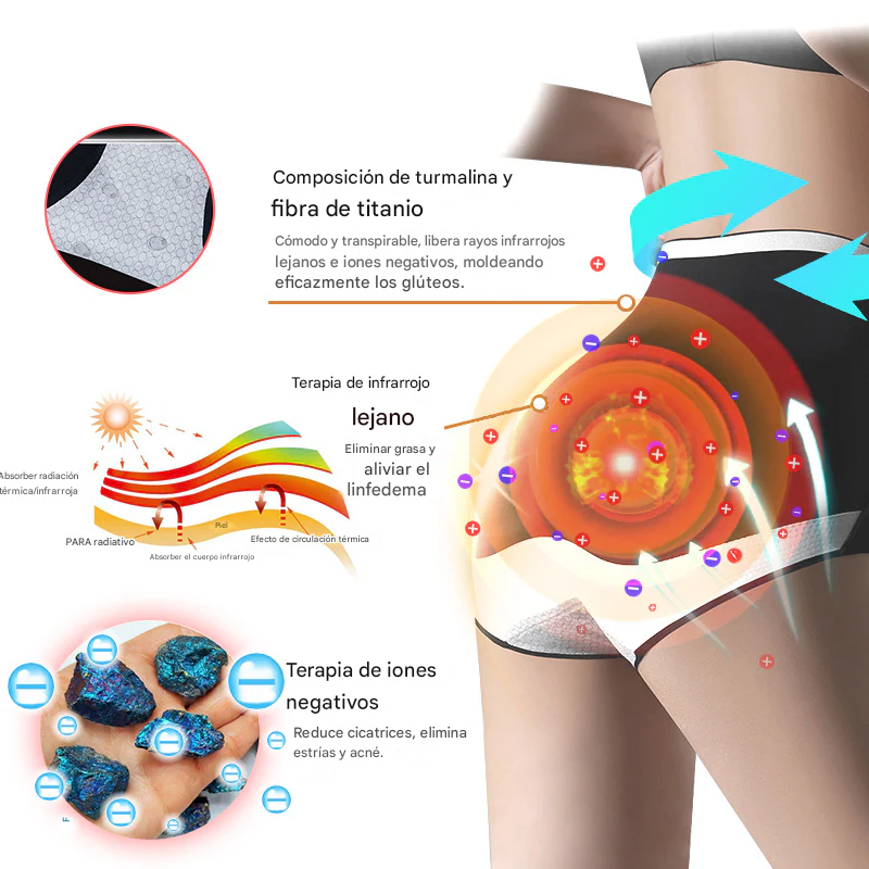 Nuestros shorts están fabricados con fibra de titanio de grado médico y turmalina, ofreciendo beneficios respaldados científicamente como: