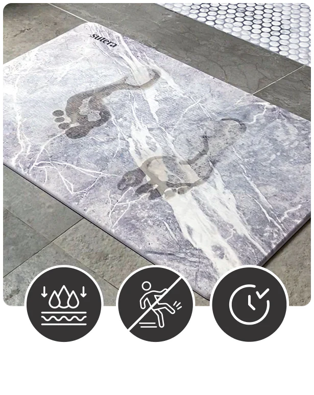 Nuestro innovador material de tierra de diatomeas absorbe el agua al instante, manteniendo el suelo seco y seguro. Las alfombras de baño son caldo de cultivo para todo tipo de "elementos indeseables", que pueden transferirse al cuerpo y provocar irritación de la piel o algo peor, sin mencionar, las personas que se resbalan en suelos de baño mojados cada año.